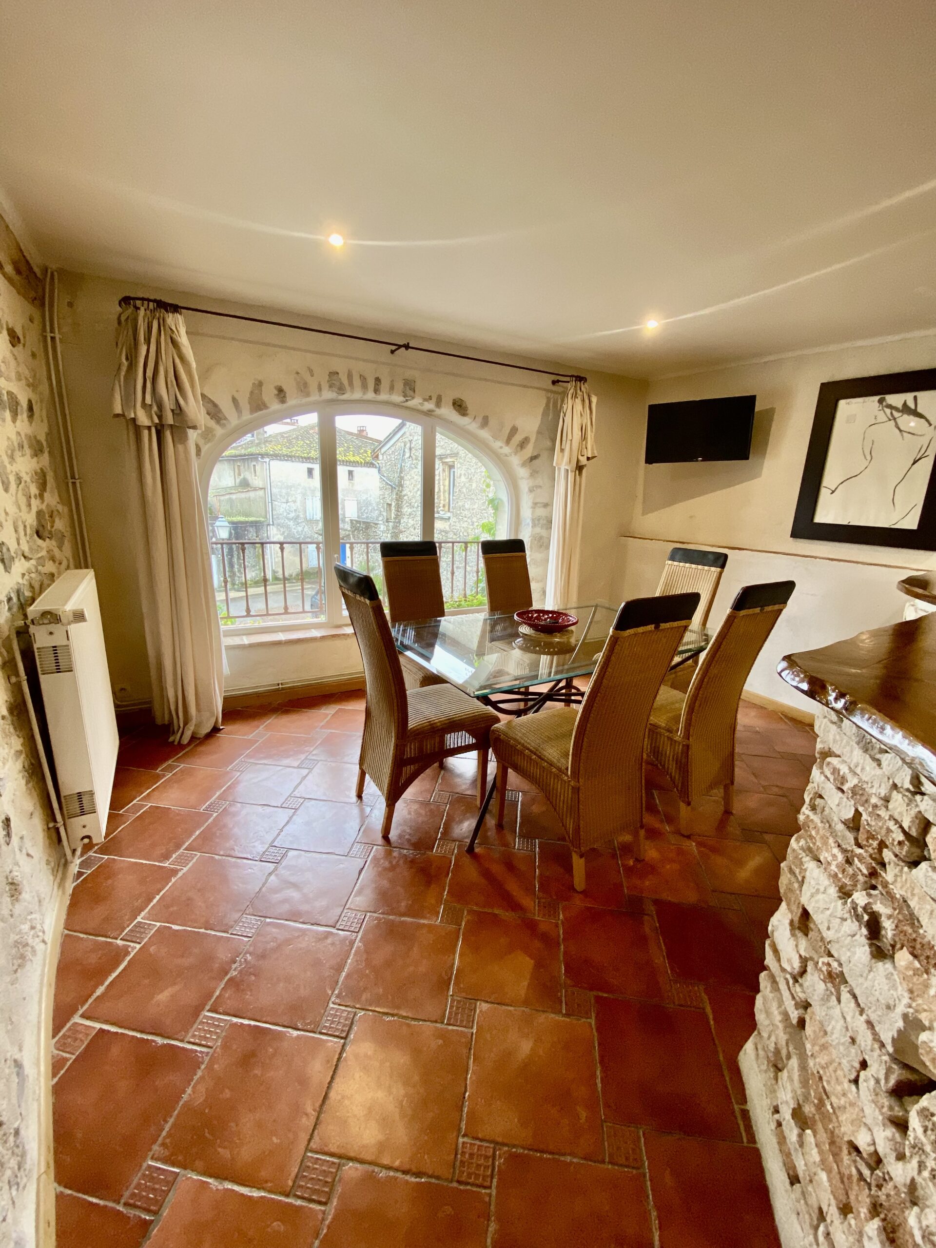 - Vue sur la verrière et la piscine pour les gîtes « Sampzon » et « Razal » et superbe baie vitrée en arcade avec vue sur la placette du hameau pour le gîte « Coucouru ».
